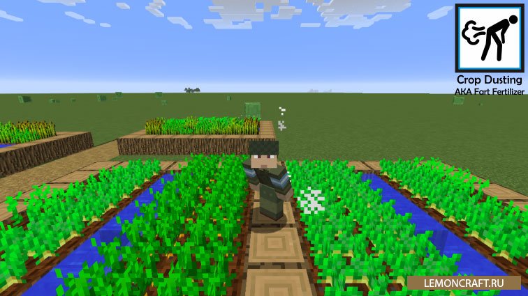 Непонятно с какой целью автор создал именно такой ускоритель растений, но мод Crop Dusting работает. Если вы подойдете к растениям и пукните на него, его рост ускорится. Данный мод позволит сэкономит на таком ресурсе, как костная мука.